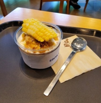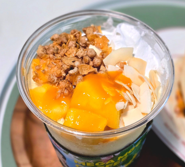 - 망빙 파르페(₩4,400): 우유빙수베이스 위에 망고, 코코넛칩, 휘핑 크림, 시리얼이 흩뿌려진 상큼하고 이국적인 디저트입니다
