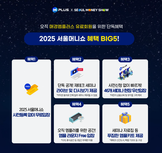 - 1. 2025 서울머니쇼는 온라인 사전등록자, 매경엠플러스 유료회원, 무료입장권 소지한 본인에 한하여 전시장 무료 입장이 가능합니다.